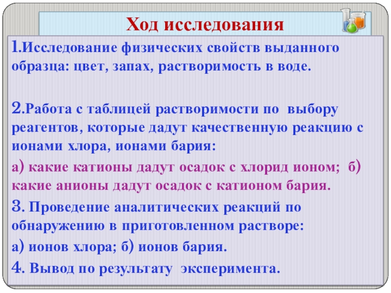 1.Исследование физических свойств выданного образца: цвет, запах, растворимость в воде.