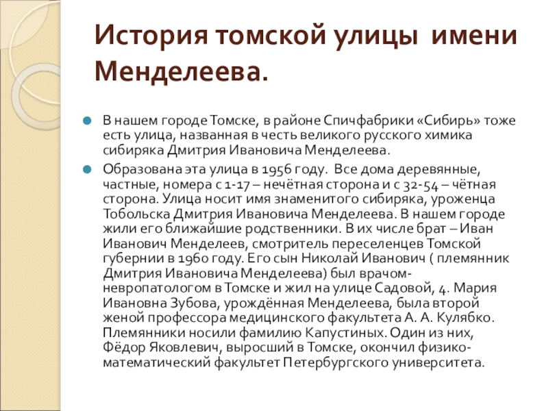 Образована эта улица в 1956 году. Все дома деревянные, частные, номера с 1-17 – нечётная сторона и с 32-54 – чётная сторона. Улица носит имя знаменитого сибиряка, уроженца Тобольска Дмитрия Ивановича Менделеева. В нашем городе жили его ближайшие родственники. В их числе брат – Иван Иванович Менделеев, смотритель переселенцев Томской губернии в 1960 году. Его сын Николай Иванович ( племянник Дмитрия Ивановича Менделеева) был врачом-невропатологом в Томске и жил на улице Садовой, 4. Мария Ивановна Зубова, урождённая Менделеева, была второй женой профессора медицинского факультета А. А. Кулябко. Племянники носили фамилию Капустиных. Один из них, Фёдор Яковлевич, выросший в Томске, окончил физико-математический факультет Петербургского университета.