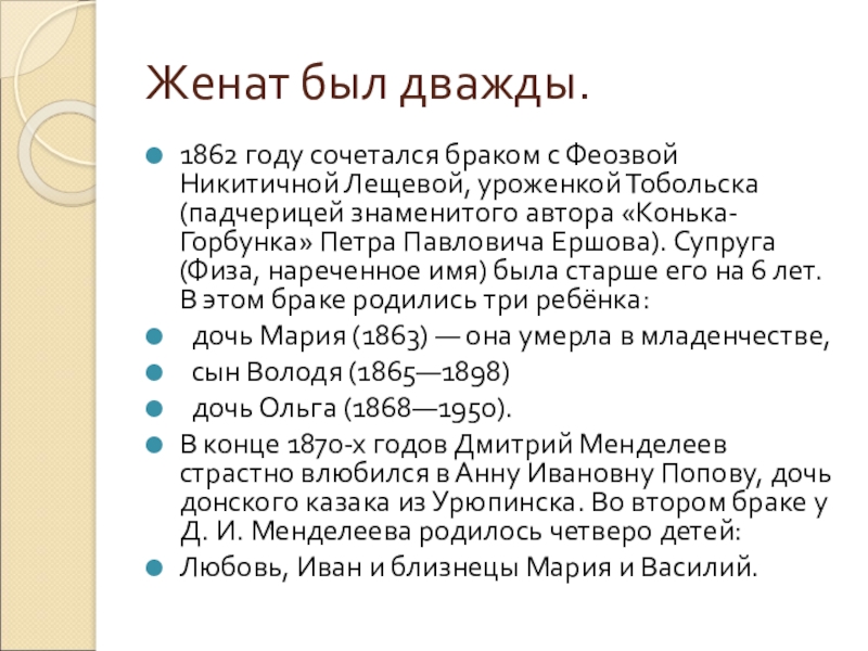 В конце 1870-х годов Дмитрий Менделеев страстно влюбился в Анну Ивановну Попову, дочь донского казака из Урюпинска. Во втором браке у Д. И. Менделеева родилось четверо детей:
