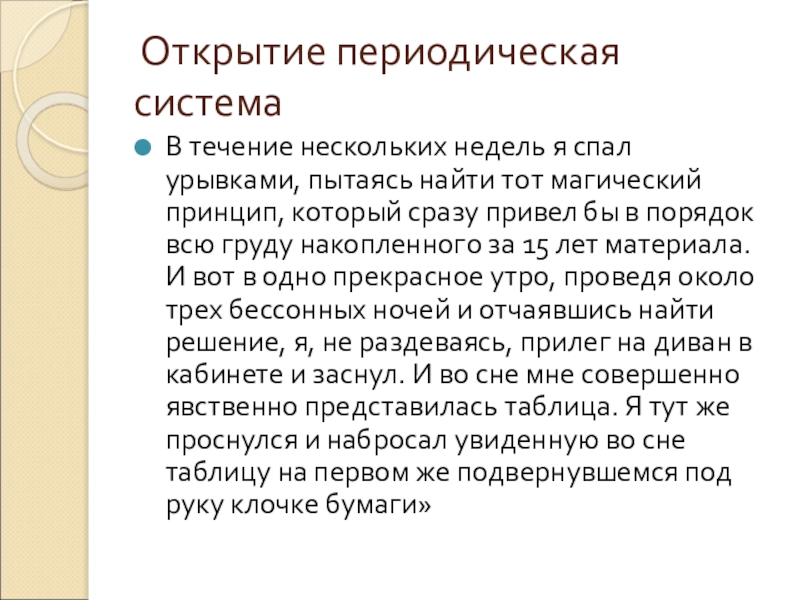 найти тот магический принцип, который сразу привел бы в порядок всю груду накопленного за 15 лет материала. И вот в одно прекрасное утро, проведя около трех бессонных ночей и отчаявшись найти решение, я, не раздеваясь, прилег на диван в кабинете и заснул. И во сне мне совершенно явственно представилась таблица. Я тут же проснулся и набросал увиденную во сне таблицу на первом же подвернувшемся под руку клочке бумаги»