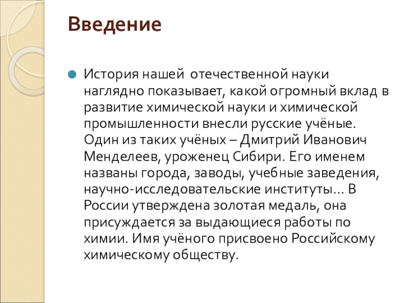 химической науки и химической промышленности внесли русские учёные. Один из таких учёных – Дмитрий Иванович Менделеев, уроженец Сибири. Его именем названы города, заводы, учебные заведения, научно-исследовательские институты… В России утверждена золотая медаль, она присуждается за выдающиеся работы по химии. Имя учёного присвоено Российскому химическому обществу.