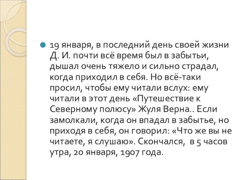 время был в забытьи, дышал очень тяжело и сильно страдал, когда приходил в себя. Но всё-таки просил, чтобы ему читали вслух: ему читали в этот день «Путешествие к Северному полюсу» Жуля Верна.. Если замолкали, когда он впадал в забытье, но приходя в себя, он говорил: «Что же вы не читаете, я слушаю». Скончался, в 5 часов утра, 20 января, 1907 года.