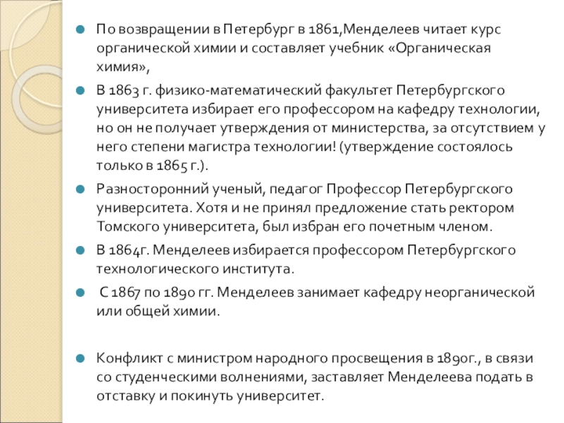 Слайд 17По возвращении в Петербург в 1861,Менделеев читает курс органической химии и