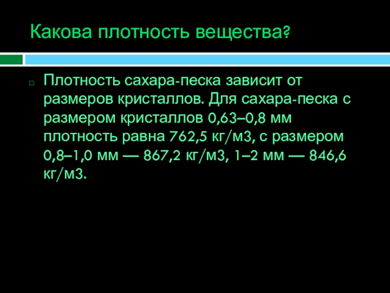 Какова плотность вещества?Плотность сахара-песка зависит от размеров кристаллов. Для сахара-песка с размером кристаллов 0,63–0,8 мм плотность равна