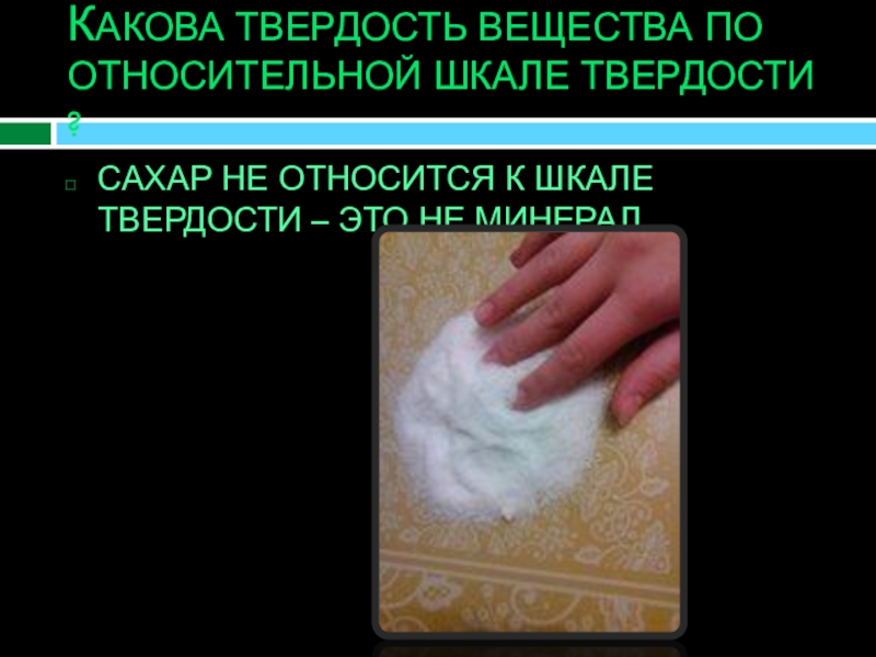 КАКОВА ТВЕРДОСТЬ ВЕЩЕСТВА ПО ОТНОСИТЕЛЬНОЙ ШКАЛЕ ТВЕРДОСТИ ?САХАР НЕ ОТНОСИТСЯ К ШКАЛЕ ТВЕРДОСТИ – ЭТО НЕ МИНЕРАЛ.