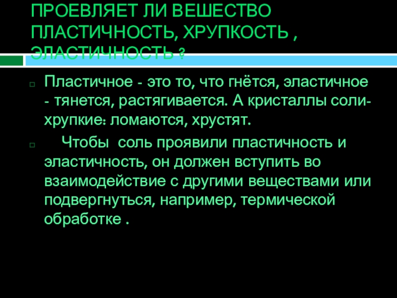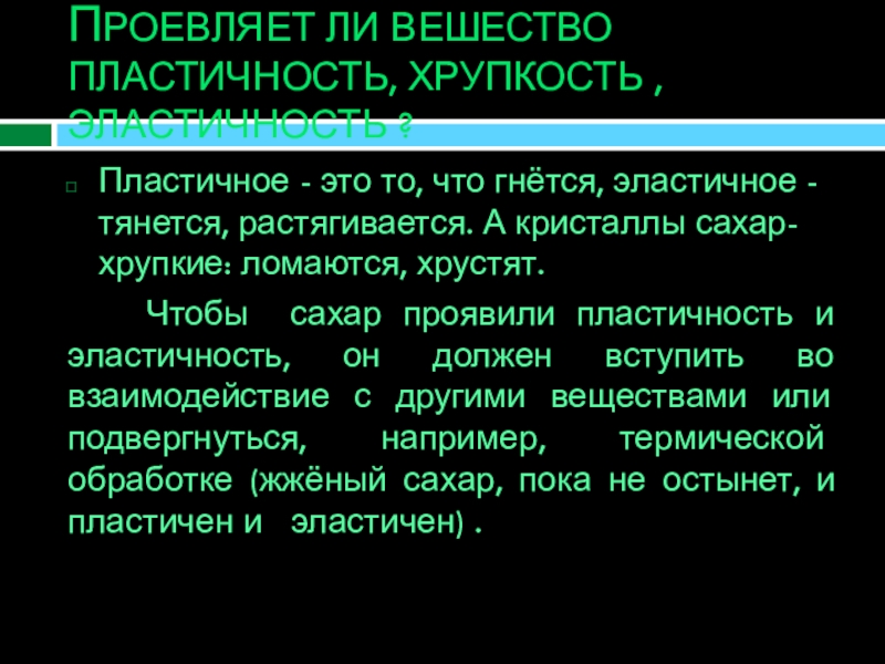 Слайд 7ПРОЕВЛЯЕТ ЛИ ВЕШЕСТВО ПЛАСТИЧНОСТЬ, ХРУПКОСТЬ , ЭЛАСТИЧНОСТЬ ?