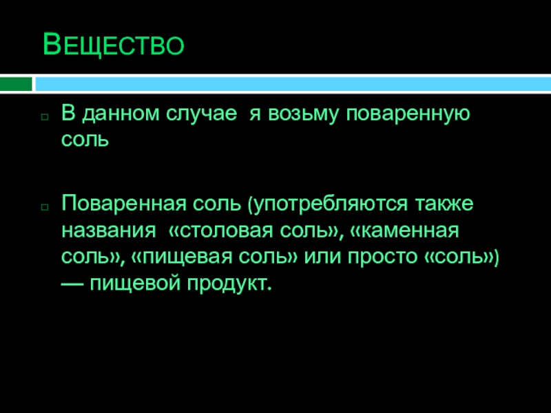 ВЕЩЕСТВОВ данном случае я возьму поваренную сольПоваренная соль (употребляются также названия «столовая соль», «каменная соль», «пищевая соль»