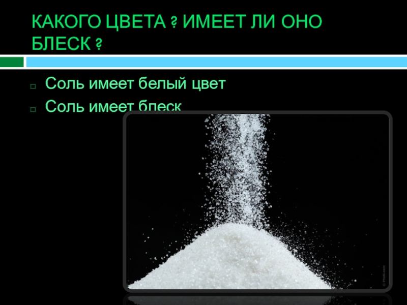 КАКОГО ЦВЕТА ? ИМЕЕТ ЛИ ОНО БЛЕСК ?Соль имеет белый цветСоль имеет блеск