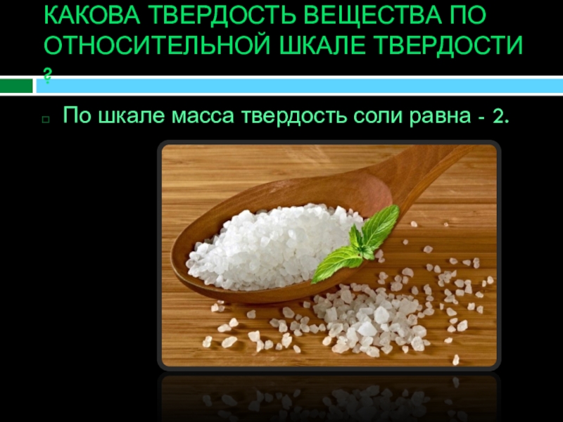 КАКОВА ТВЕРДОСТЬ ВЕЩЕСТВА ПО ОТНОСИТЕЛЬНОЙ ШКАЛЕ ТВЕРДОСТИ ?По шкале масса твердость соли равна - 2.