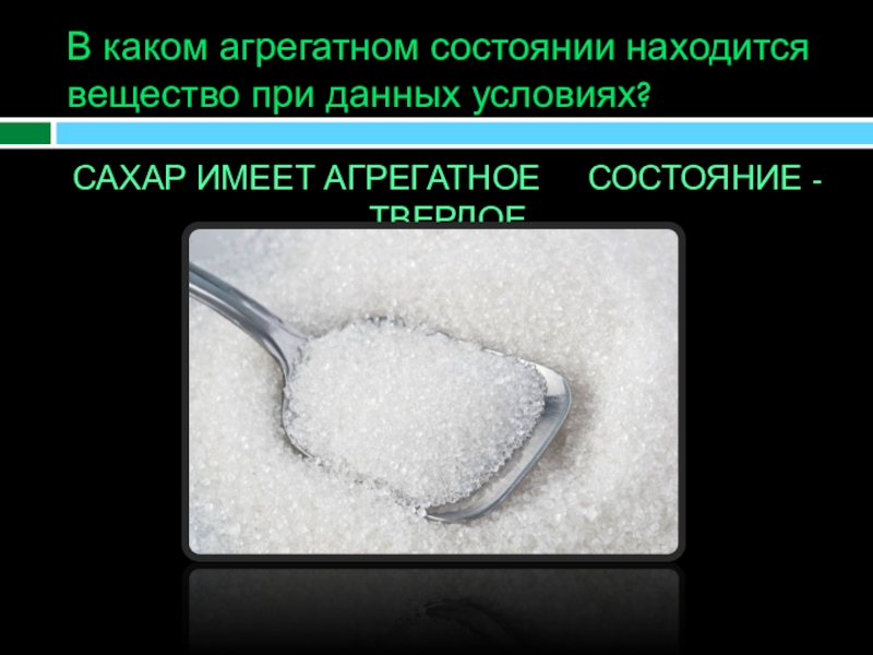 В каком агрегатном состоянии находится вещество при данных условиях? САХАР ИМЕЕТ АГРЕГАТНОЕ   СОСТОЯНИЕ - ТВЕРДОЕ