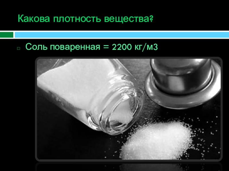 Какова плотность вещества?Соль поваренная = 2200 кг/м3