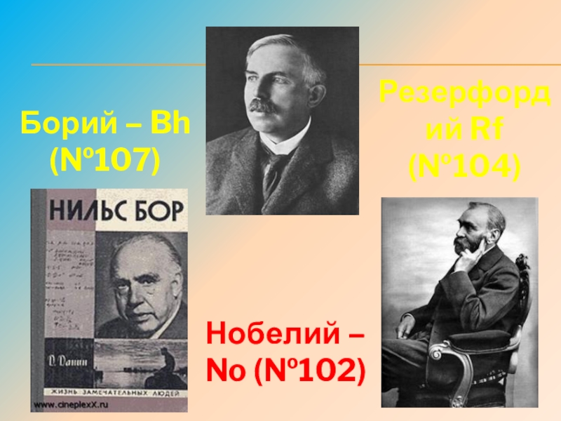 Борий – Bh (№107)Нобелий – No (№102)Резерфордий Rf (№104)