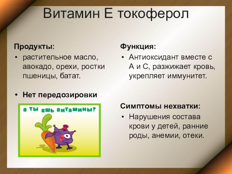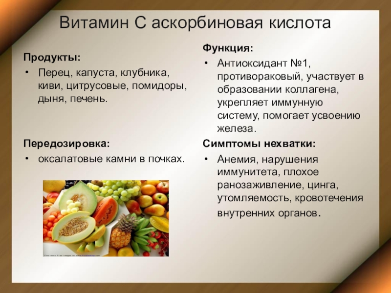 Антиоксидант №1, противораковый, участвует в образовании коллагена, укрепляет иммунную систему, помогает усвоению железа.