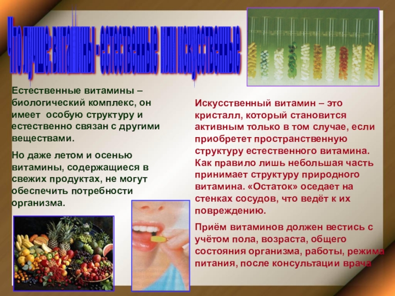 Искусственный витамин – это кристалл, который становится активным только в том случае, если приобретет пространственную структуру естественного витамина. Как правило лишь небольшая часть принимает структуру природного витамина. «Остаток» оседает на стенках сосудов, что ведёт к их повреждению.