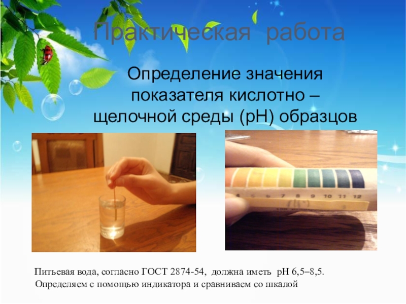Питьевая вода, согласно ГОСТ 2874-54, должна иметь рН 6,5–8,5.