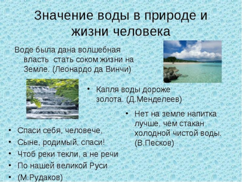 в природе. Среди всех веществ, присутствующих на земле, вода благодаря своим свойствам занимает исключительное положение в природе и играет особую роль в существовании органической жизни.