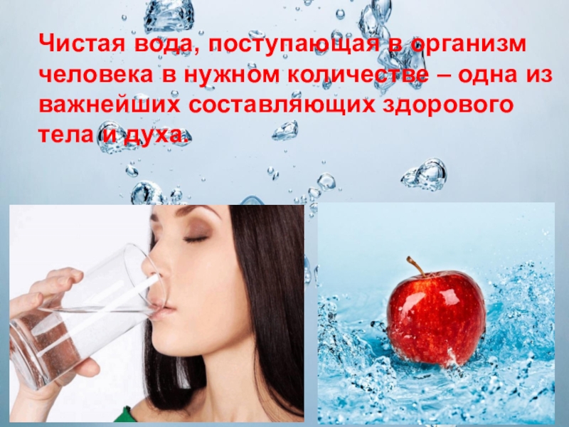 Слайд 23 Чистая вода, поступающая в организм человека в нужном количестве