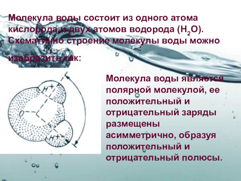 Молекула воды является полярной молекулой, ее положительный и отрицательный заряды размещены асимметрично, образуя положительный и отрицательный полюсы.