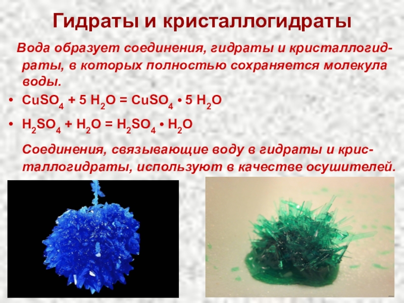 Вода образует соединения, гидраты и кристаллогид-раты, в