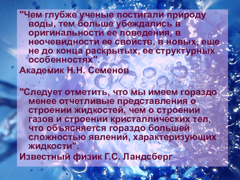 Слайд 5"Чем глубже ученые постигали природу воды, тем больше убеждались в оригинальности