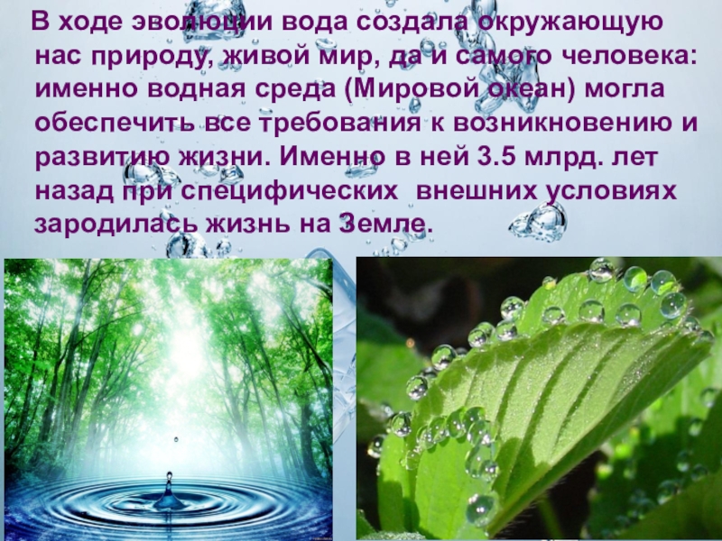 Слайд 18 В ходе эволюции вода создала окружающую нас природу, живой