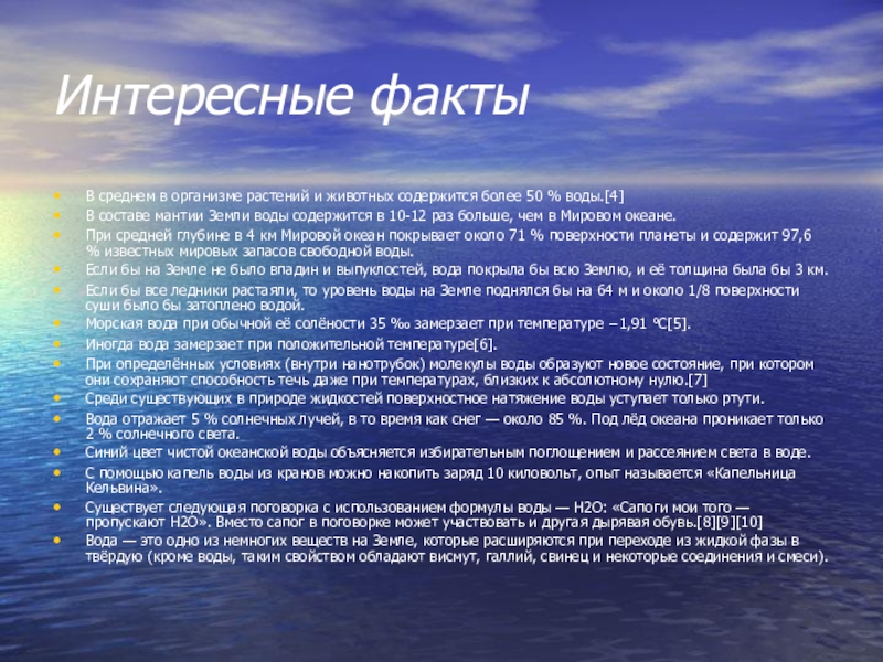 имеющая цвета (в малом объёме) и запаха. Химическая формула: Н2O. В твёрдом состоянии называется льдом или снегом, а в газообразном — водяным паром. Около 71 % поверхности Земли покрыто водой (океаны, моря, озёра, реки, лёд на полюсах).