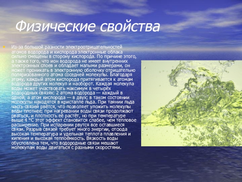 сильно смещены в сторону кислорода. По причине этого, а также того, что ион водорода не имеет внутренних электронных слоев и обладает малыми размерами, он может проникать в электронную оболочку отрицательно поляризованного атома соседней молекулы. Благодаря этому, каждый атом кислорода притягивается к атомам водорода других молекул и наоборот. Каждая молекула воды может участвовать максимум в четырёх водородных связях: 2 атома водорода — каждый в одной, а атом кислорода — в двух; в таком состоянии молекулы находятся в кристалле льда. При таянии льда часть связей рвётся, что позволяет уложить молекулы воды плотнее; при нагревании воды связи продолжают рваться, и плотность её растёт, но при температуре выше 4 °С этот эффект становится слабее, чем тепловое расширение. При испарении рвутся все оставшиеся связи. Разрыв связей требует много энергии, отсюда высокая температура и удельная теплота плавления и кипения и высокая теплоёмкость. Вязкость воды обусловлена тем, что водородные связи мешают молекулам воды двигаться с разными скоростями.