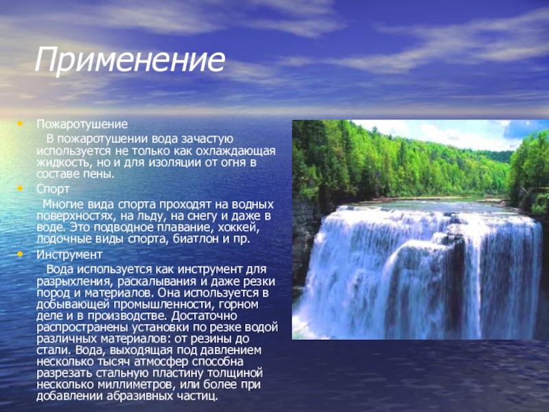 Вода является растворителем для многих веществ. Она используется для очистки как самого человека, так и различных объектов человеческой деятельности. Вода используется как растворитель в промышленности.