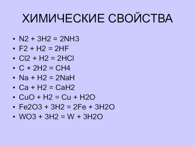 ХИМИЧЕСКИЕ СВОЙСТВАN2 + 3H2 = 2NH3 ​F2 + H2 = 2HF​Cl2 + H2 = 2HCl​C + 2H2 =