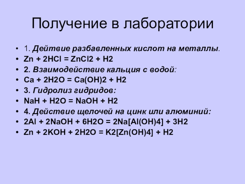 Получение в лаборатории1. Дейтвие разбавленных кислот на металлы. ​Zn + 2HCl = ZnCl2 + H2 ​2. Взаимодействие кальция с водой:​Ca + 2H2O
