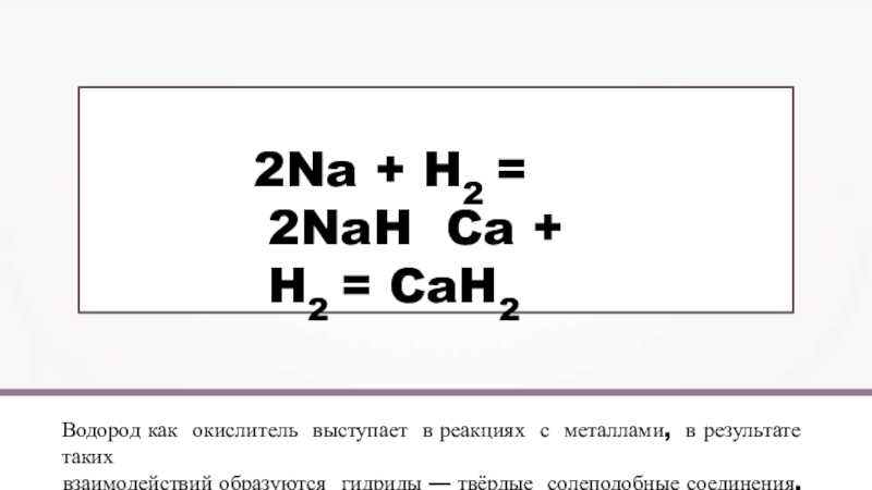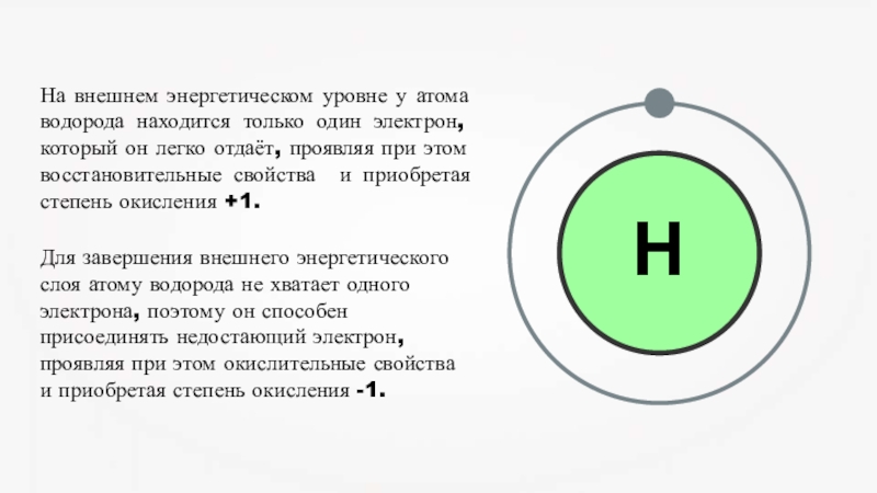 Для завершения внешнего энергетического слоя атому водорода не хватает одного электрона, поэтому он способен присоединять недостающий электрон, проявляя при этом окислительные свойства и приобретая степень окисления -1.