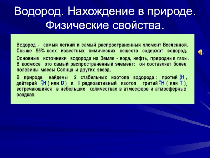 Природный водород состоит из смеси двух стабильных нуклидов с массовыми числами 1,007825 (99,985 % в смеси) и 2,0140 (0,015 %). Кроме того, в природном водороде всегда присутствуют ничтожные количества радиоактивного нуклида — трития 3Н (период полураспада Т1/212,43 года). Так как в ядре атома водорода содержится только 1 протон (меньше в ядре атома элемента протонов быть не может), то иногда говорят, что водород образует естественную нижнюю границу периодической системы элементов Д. И. Менделеева (хотя сам элемент водород расположен в самой верхней части таблицы). Элемент водород расположен в первом периоде таблицы Менделеева. Его относят и к 1-й группе (группе IА щелочных металлов), и к 7-й группе (группе VIIA галогенов).