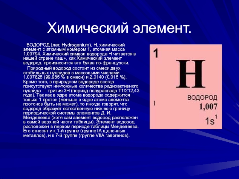 Hydrogenium), H, химический элемент с атомным номером 1, атомная масса 1.00794. Химический символ водорода Н читается в нашей стране «аш», как Химический элемент водород. произносится эта буква по-французски.