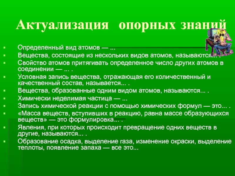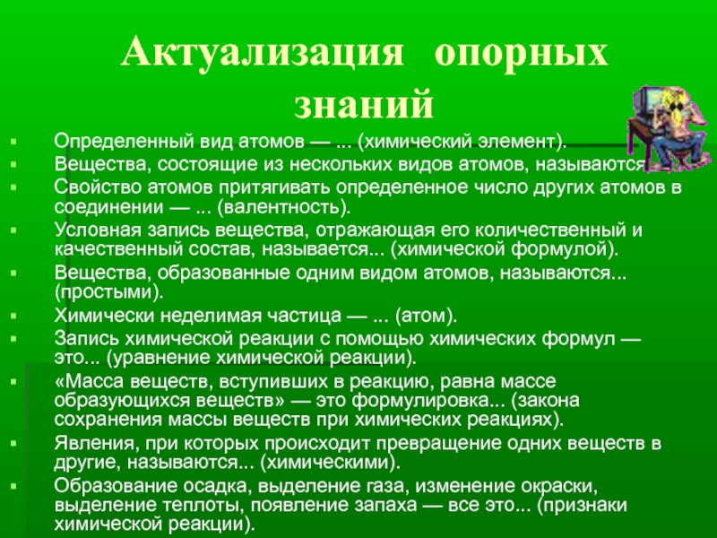 «Масса веществ, вступивших в реакцию, равна массе образующихся веществ» — это формулировка... (закона сохранения массы веществ при химических реакциях).
