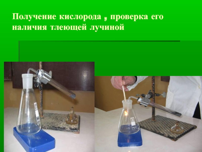 Слайд 13Получение кислорода , проверка его наличия тлеющей лучиной