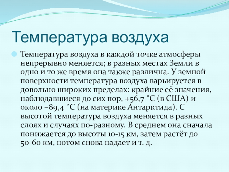 местах Земли в одно и то же время она также различна. У земной поверхности температура воздуха варьируется в довольно широких пределах: крайние её значения, наблюдавшиеся до сих пор, +56,7 ˚С (в США) и около −89,4 ˚С (на материке Антарктида). С высотой температура воздуха меняется в разных слоях и случаях по-разному. В среднем она сначала понижается до высоты 10-15 км, затем растёт до 50-60 км, потом снова падает и т. д.