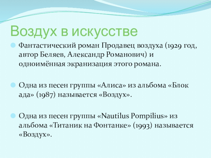 Одна из песен группы «Nautilus Pompilius» из альбома «Титаник на Фонтанке» (1993) называется «Воздух».