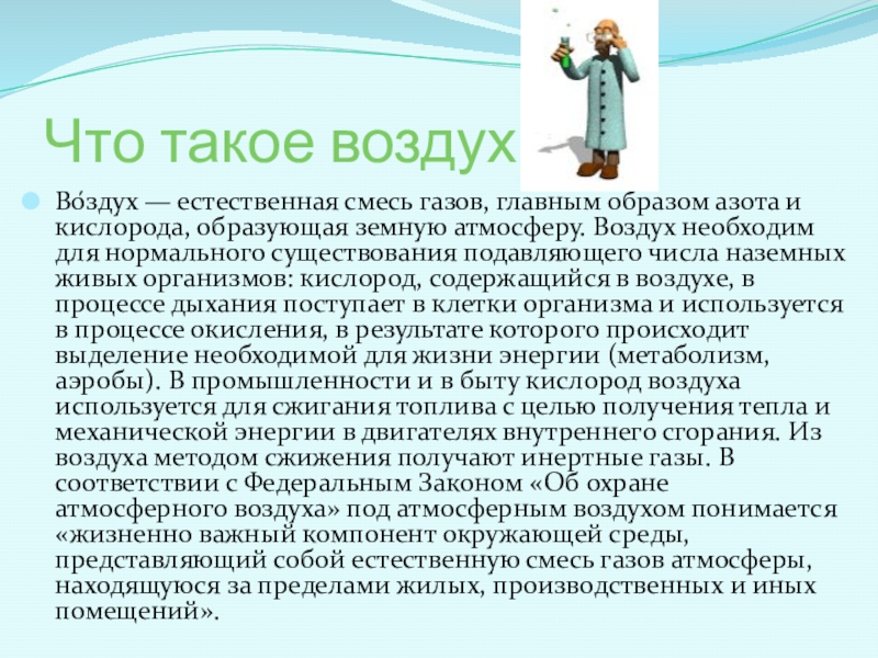 кислорода, образующая земную атмосферу. Воздух необходим для нормального существования подавляющего числа наземных живых организмов: кислород, содержащийся в воздухе, в процессе дыхания поступает в клетки организма и используется в процессе окисления, в результате которого происходит выделение необходимой для жизни энергии (метаболизм, аэробы). В промышленности и в быту кислород воздуха используется для сжигания топлива с целью получения тепла и механической энергии в двигателях внутреннего сгорания. Из воздуха методом сжижения получают инертные газы. В соответствии с Федеральным Законом «Об охране атмосферного воздуха» под атмосферным воздухом понимается «жизненно важный компонент окружающей среды, представляющий собой естественную смесь газов атмосферы, находящуюся за пределами жилых, производственных и иных помещений».