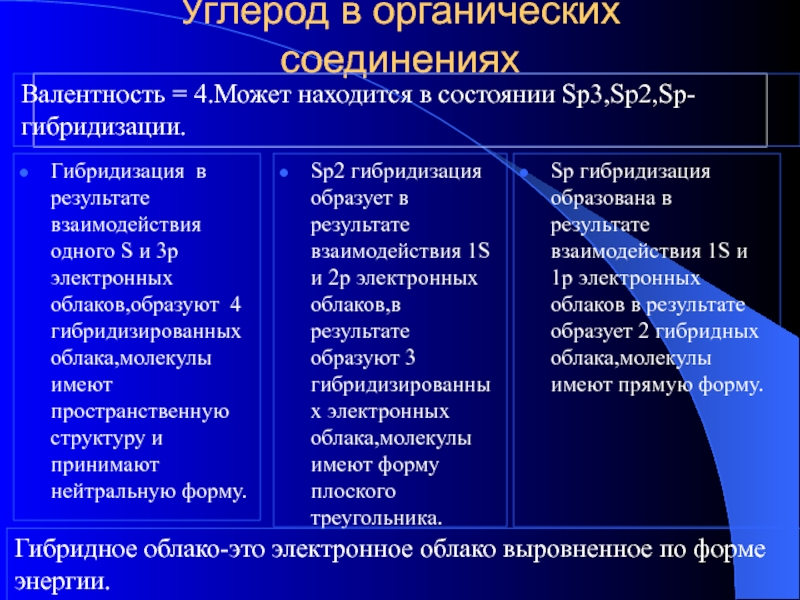 Валентность = 4.Может находится в состоянии Sp3,Sp2,Sp-гибридизации.