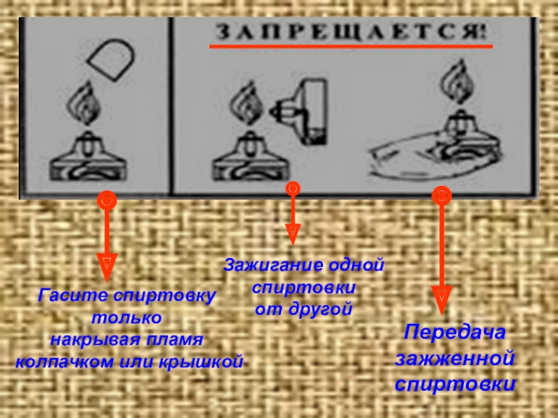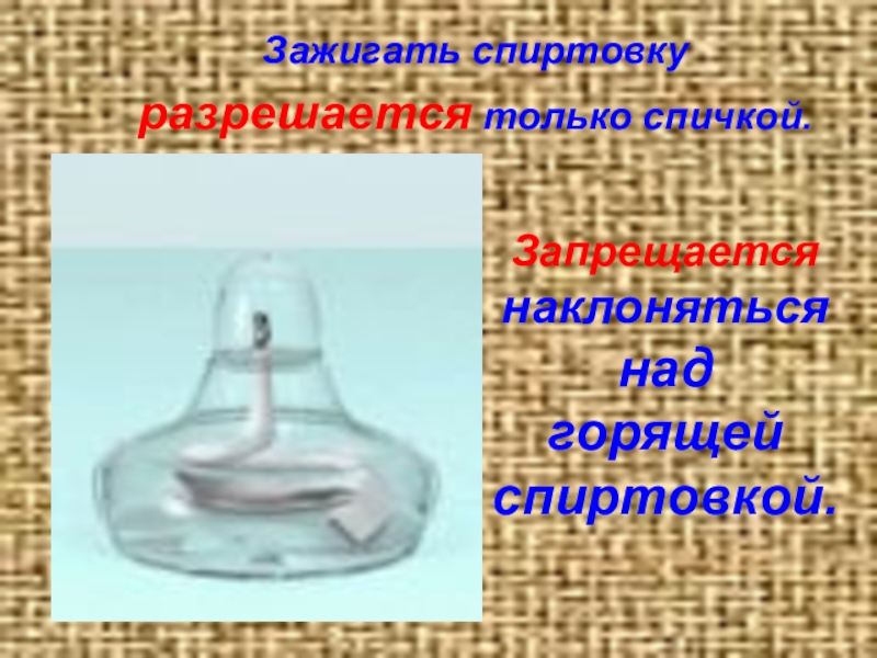 Зажигать спиртовку разрешается только спичкой.Запрещается наклоняться надгорящей спиртовкой.