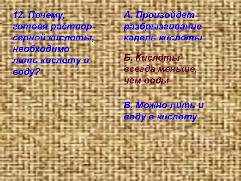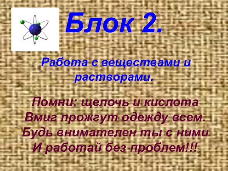 Блок 2.   Работа с веществами и растворами.Помни: щелочь и кислотаВмиг прожгут одежду всем.Будь внимателен ты
