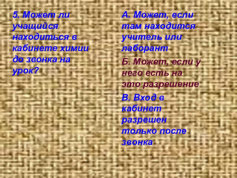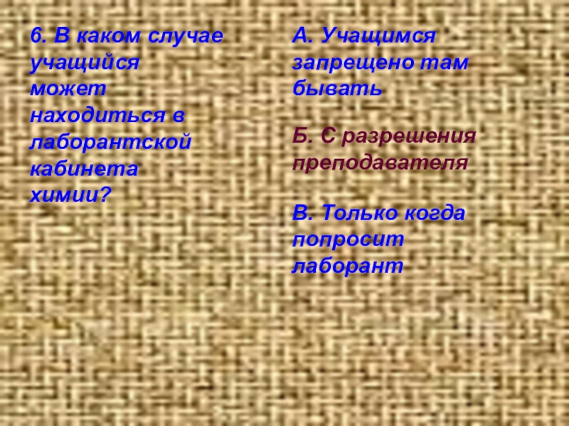 Слайд 37Блок 6. Проверка первичных знаний по технике безопасности в кабинете химии для учащихся.