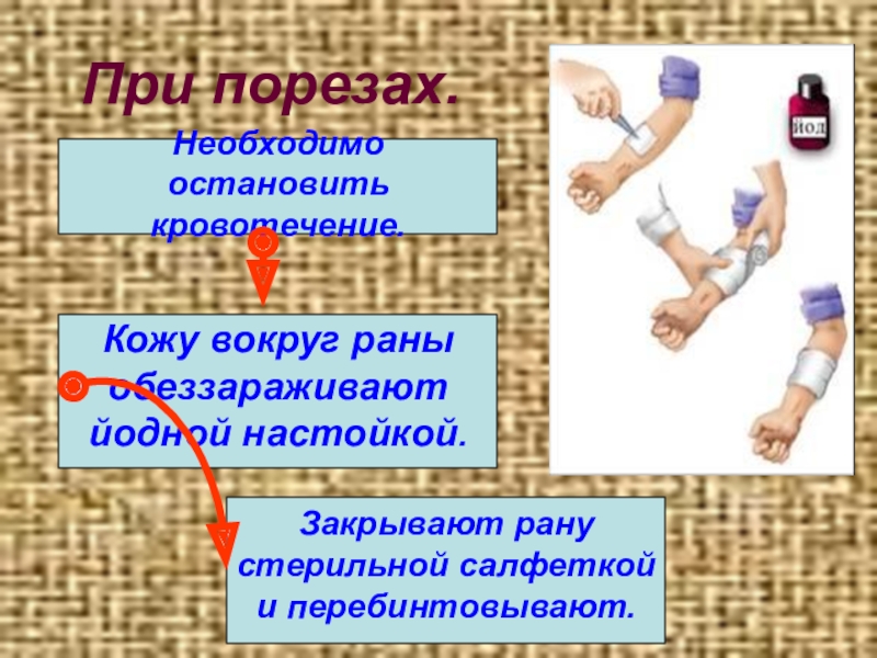 При порезах.Необходимо остановить кровотечение.Кожу вокруг раны обеззараживают йодной настойкой.Закрывают рану стерильной салфеткой и перебинтовывают.