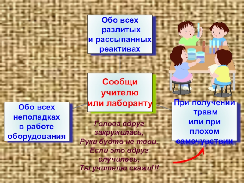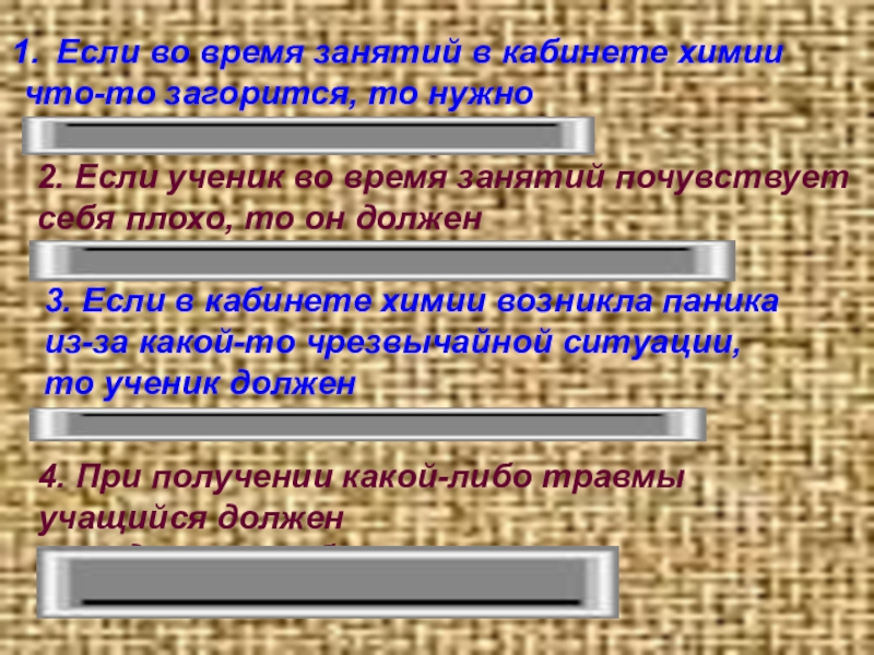Если во время занятий в кабинете химии что-то загорится, то нужно ожидать указаний учителя.2. Если ученик во