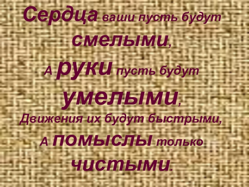Сердца ваши пусть будут смелыми, А руки пусть будут умелыми, Движения их будут быстрыми, А помыслы только
