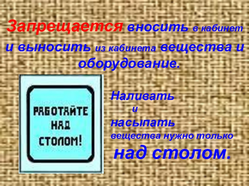Запрещается вносить в кабинет и выносить из кабинета вещества и оборудование.Наливать     и насыпатьвещества