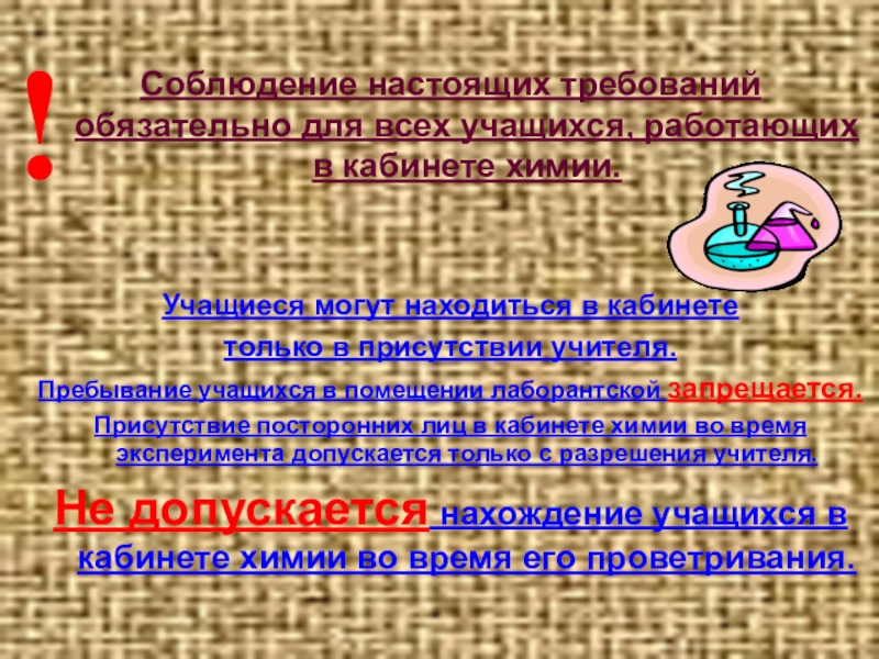 Слайд 4Соблюдение настоящих требований обязательно для всех учащихся, работающих в кабинете химии.