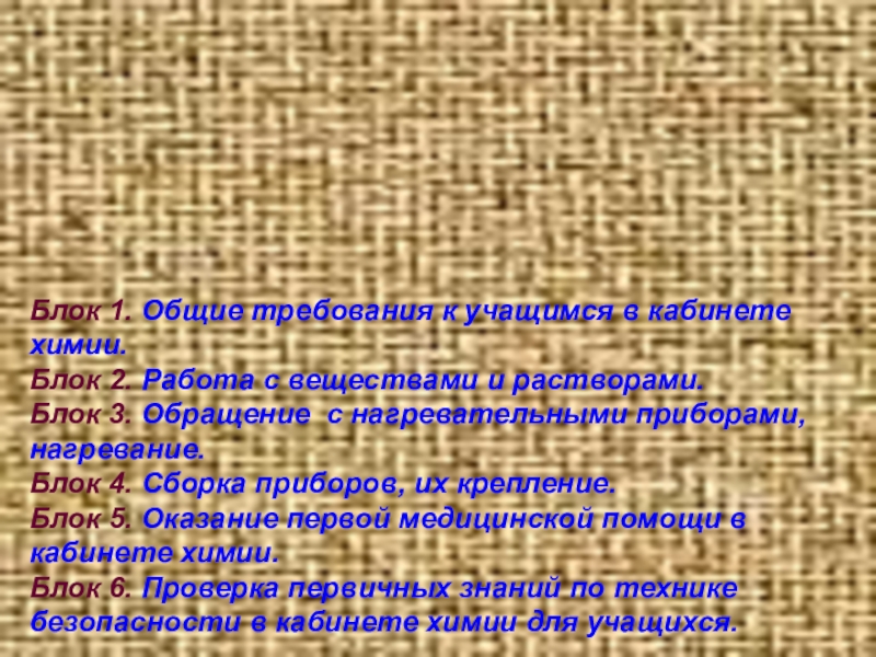 Блок 1. Общие требования к учащимся в кабинете химии. Блок 2. Работа с веществами и растворами.Блок 3. Обращение с нагревательными приборами, нагревание.Блок 4. Сборка приборов, их крепление.Блок 5. Оказание первой медицинской помощи в кабинете химии.Блок 6.