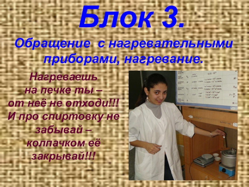 Блок 3. Обращение с нагревательными приборами, нагревание.Нагреваешь на печке ты – от неё не отходи!!!И про