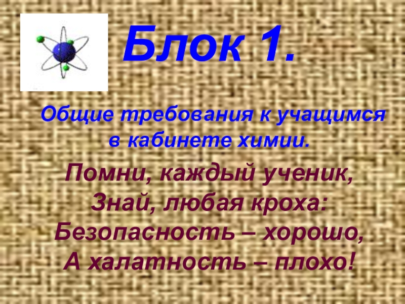 Слайд 2Блок 1. Общие требования к учащимся в кабинете химии.